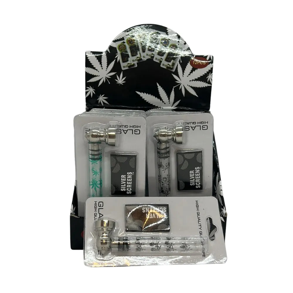 Metal & Glass Pipes available in packs of 12, and various brands/designs. Each pack is equipped with pipe screens.